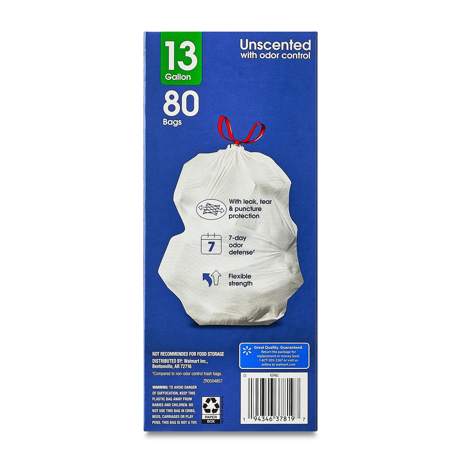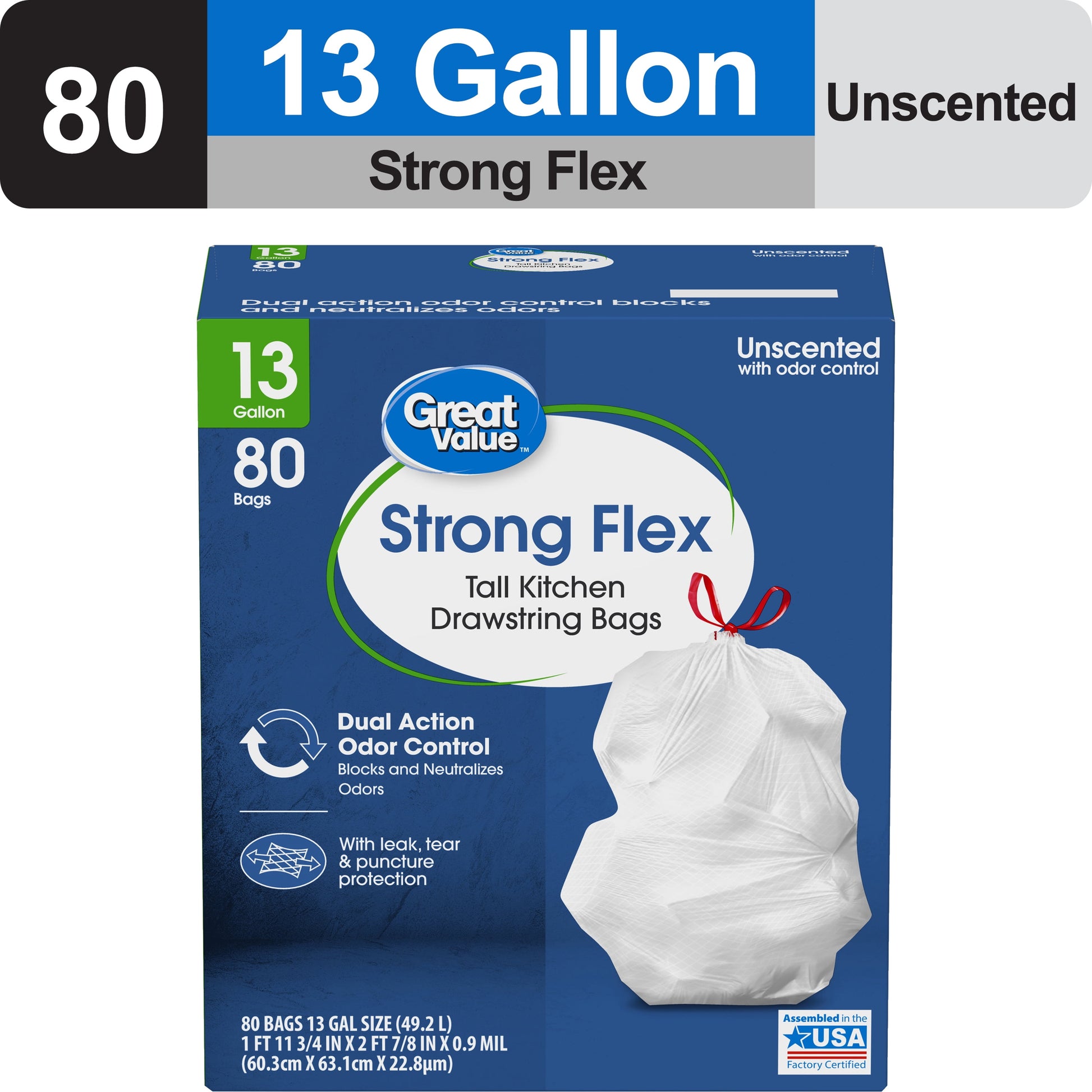 Great Value Strong Flex 13 Gallon Drawstring Tall Kitchen Trash Bags, Unscented, 80 Count