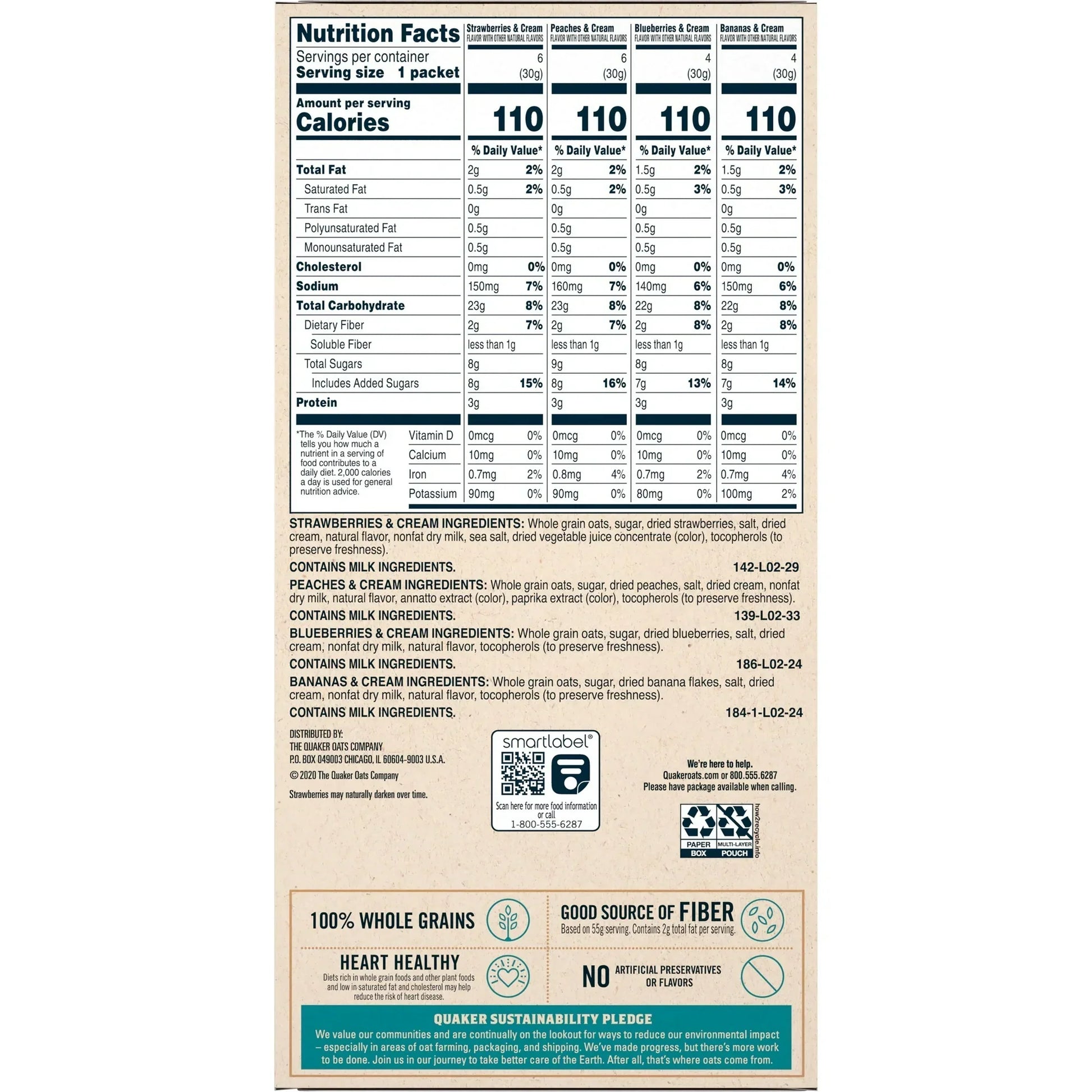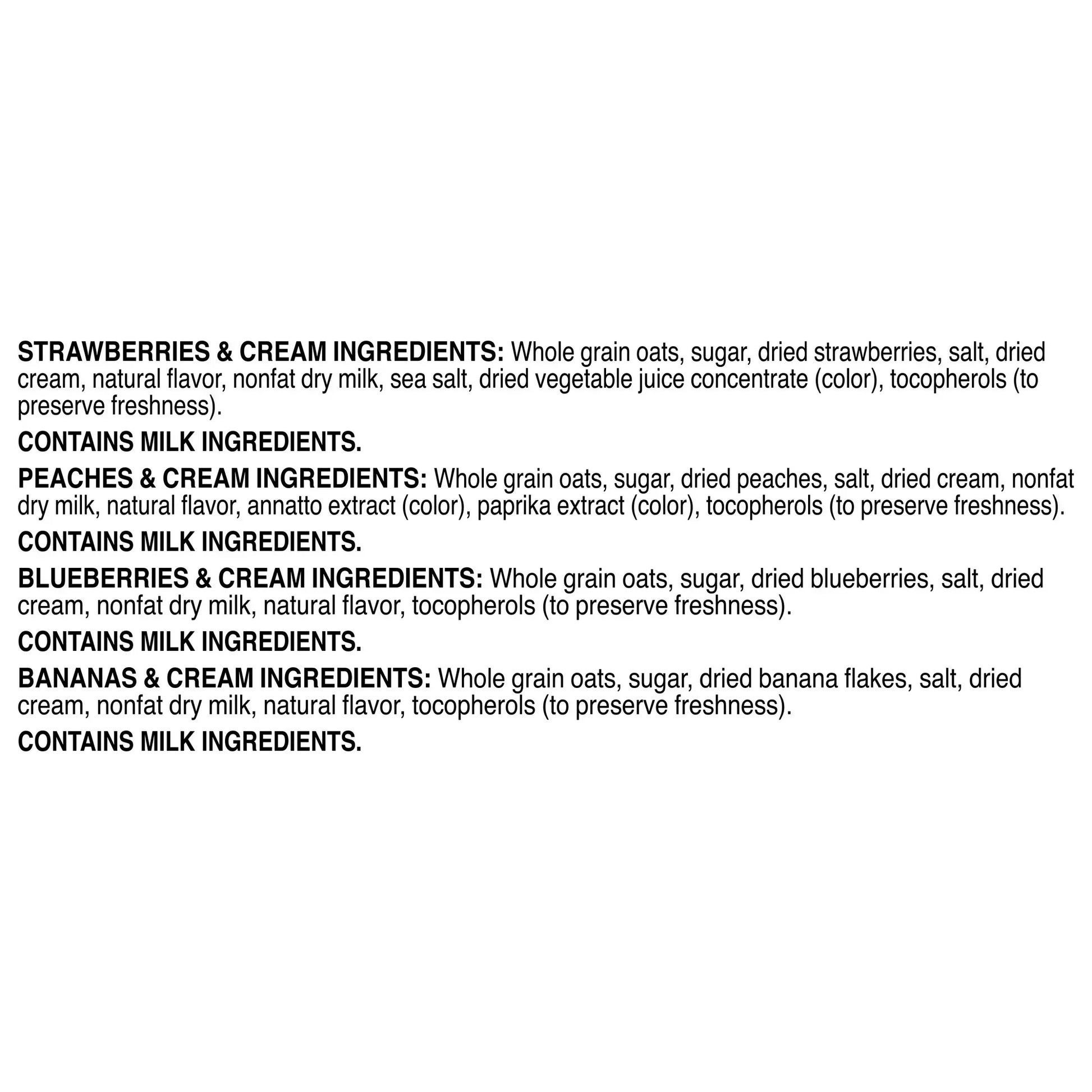 Maple & Brown Sugar: Whole Grain Rolled Oats, Sugar, Natural and Artificial Flavor, Salt, Calcium Carbonate, Guar Gum, Caramel Color, Niacinamide*, Reduced Iron, Vitamin A Palmitate, Pyridoxine Hydrochloride*, Riboflavin*, Thiamin Mononitrate*, Folic Acid*.Cinnamon & Spice: Whole Grain Rolled Oats, Sugar, Salt, Cinnamon and Other Spices, Calcium Carbonate, Guar Gum, Caramel Color, Niacinamide*, Reduced Iron, Vitamin A Palmitate, Pyridoxine Hydrochloride*, Riboflavin*, Thiamin Mononitrate*, Folic Acid*.Apples & Cinnamon: Whole Grain Rolled Oats, Sugar, Dehydrated Apples (Treated with Sodium Sulfite to Promote Color Retention), Natural and Artificial Flavor, Salt, Cinnamon, Calcium Carbonate, Citric Acid, Guar Gum, Malic Acid, Niacinamide*, Reduced Iron, Vitamin A Palmitate, Pyridoxine Hydrochloride*, Riboflavin*, Thiamin Mononitrate*, Folic Acid*, Caramel Color. One of the B Vitamins.