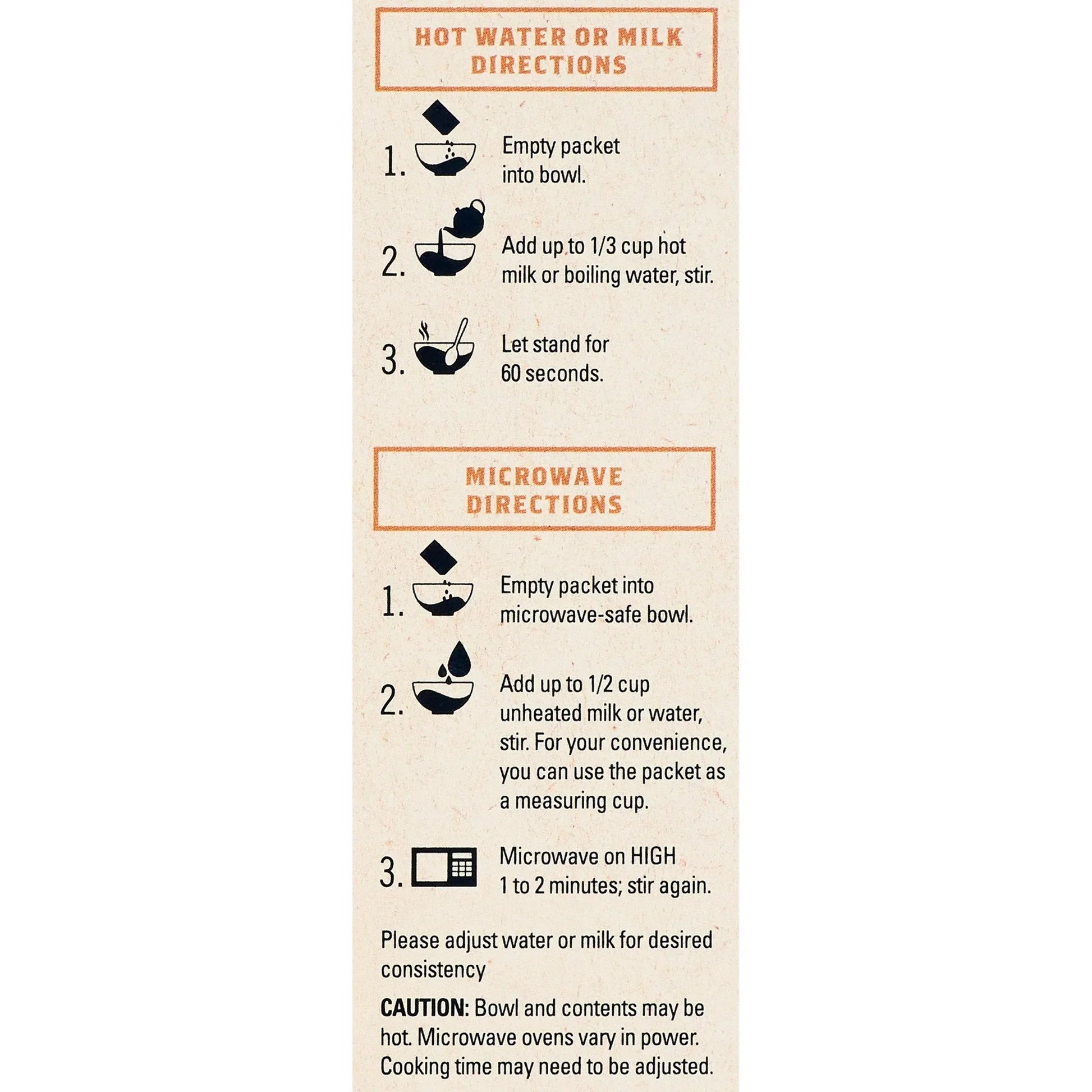 Hot Water or Milk Directions1. Empty packet into bowl.2. Add up to �� cup hot milk or boiling water, stir.3. Let stand for 60 seconds. Microwave Directions1. Empty packet into microwave���safe bowl.2. Add up to 2/3 cup unheated milk or water; stir.For your convenience, you can use the packet as a measuring cup.3. Microwave on high 1 to 2 minutes; stir again.