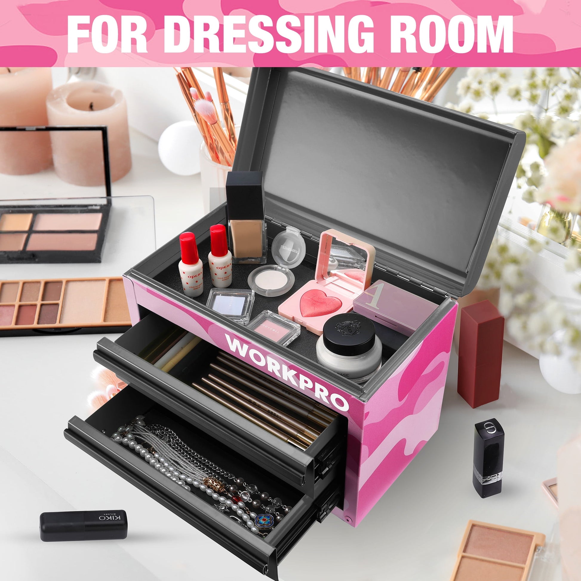 WORKPRO Mini Tool Box, 2-Drawer Metal Tool Chest with Ball Bearing Slides, Top Storage, Pink Camo